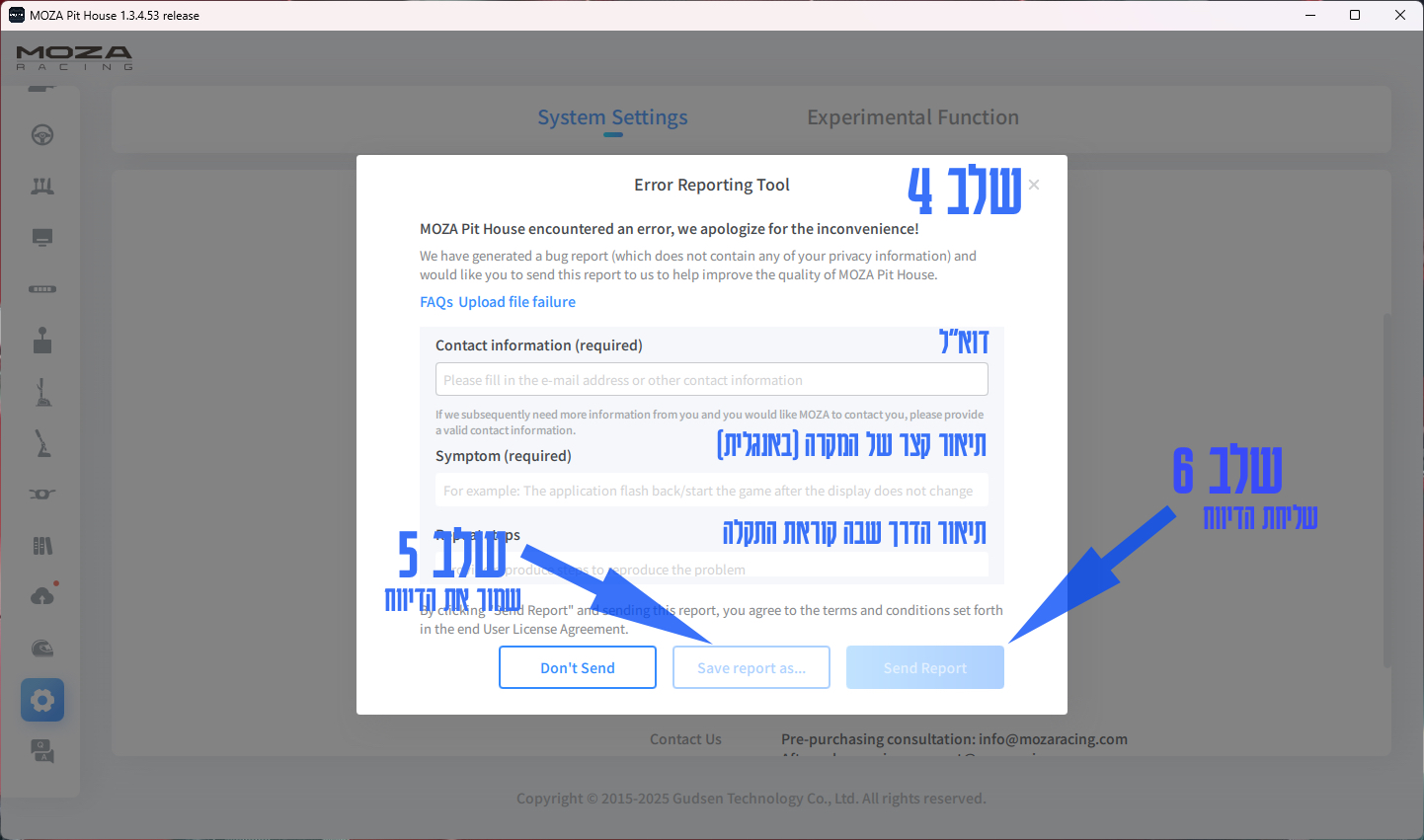 1. יש לפתוח תקלה באפליקציה Moza Pithouse לפי ההוראות בעמוד זה