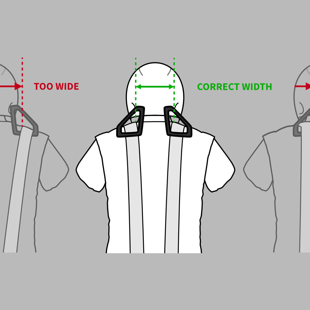 הפתרון האופטימלי הוא כאשר החגורות מיושרות ישירות מעל הכתפיים אך אינן נוגעות בצוואר (קו ירוק מקווקו).