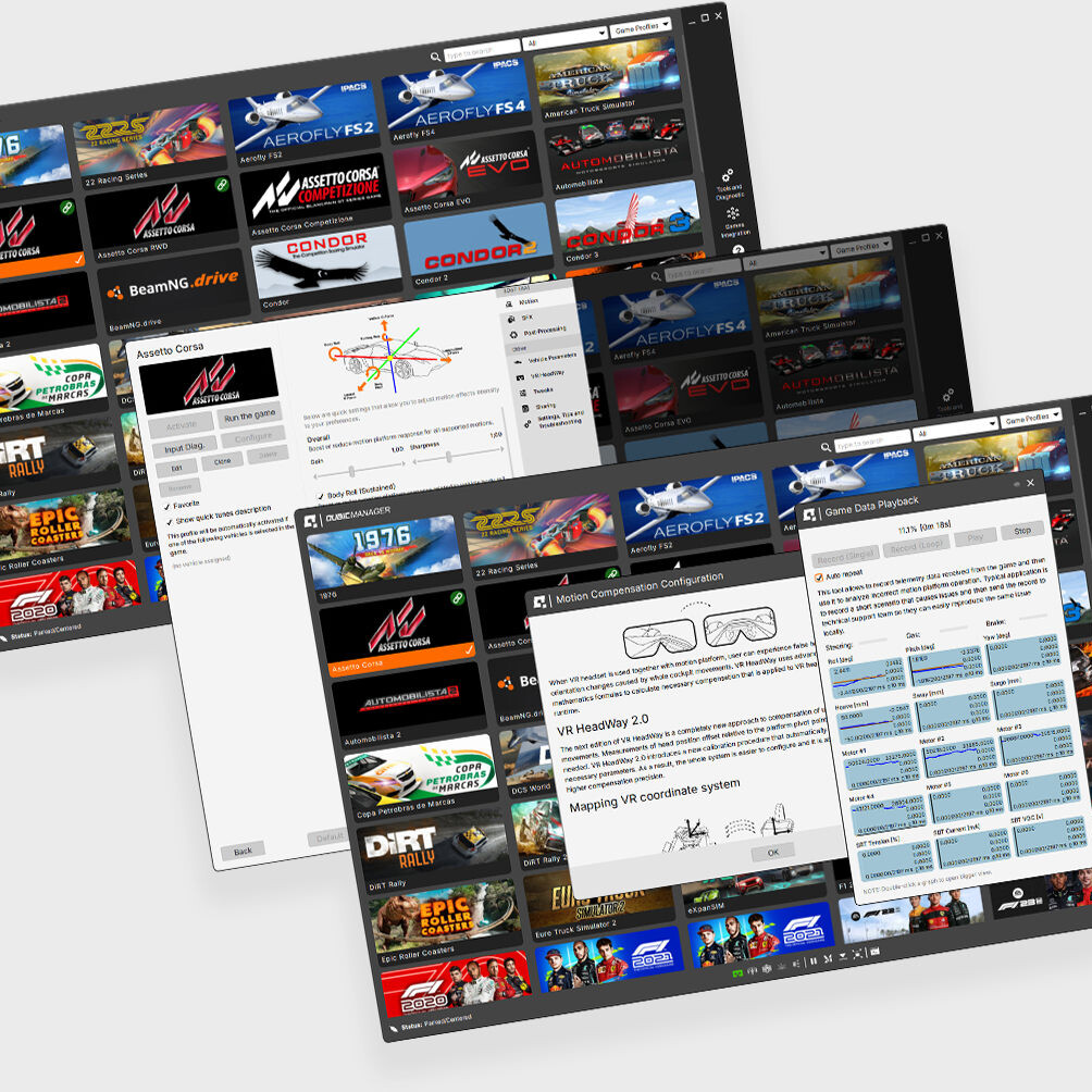 Qubic Manager היא תוכנה מקצועית וייעודית שפותחה במיוחד עבור פלטפורמות תנועה. היא תומכת בחיבור Plug & Play עם כל כותרי המרוצים והטיסה המרכזיים למחשב, ומתעדכנת באופן שוטף כדי לתמוך במשחקים חדשים עם יציאתם.